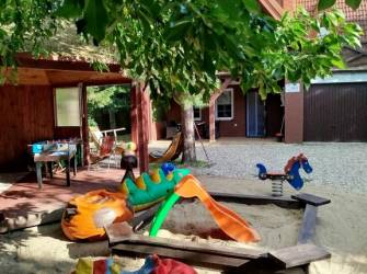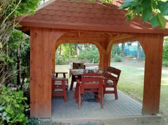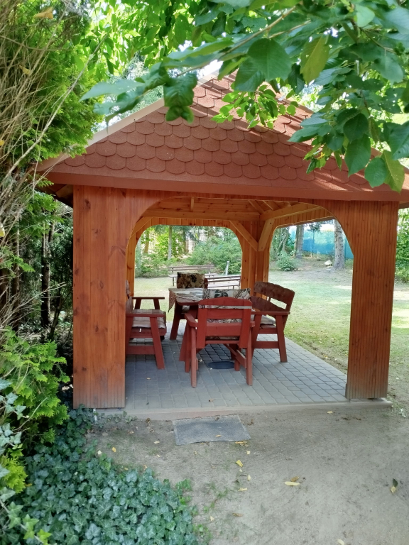 Zadaszony taras na którym znajdują się ratanowe meble ogrodowe. Można tu biesiadować niezaleznie od pogody. Taki sam taras znajduje się na piętrze. Salon z kominkiem i TV. Kuchnia z pełnym wyposażeniem, zmywarka, mikrofala,4-palnikowa kuchenka elektryczna z piekarnikiem. Łazienka z wc. Duża kanapa rogowa z funkcją spania. Stół rodzinny z krzesłami, oraz rozkładana ława przy kanapie.