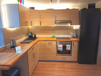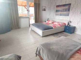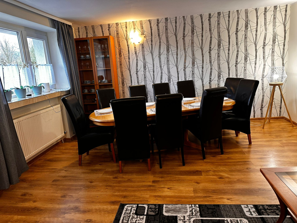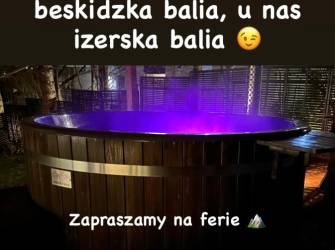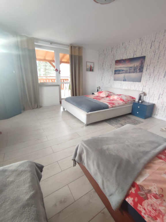 · - 3 pokoje trzyosobowe, · - 1 pokój czteroosobowy, · - 1 pokój dwuosobowy, · - salon do wspólnego spędzania wolnego czasu z wygodnymi kanapami. · - kuchnia z pełnym wyposażeniem: kuchenką ceramiczną, piekarnikiem, zmywarką, dużą lodówką, automatem do kawy, mikrofalówką, naczyniami, garnkami itd... · - salonik z bilardem i wyjściem na ogród, - gorąca beczka z jacuzzi(dod.opłata)
