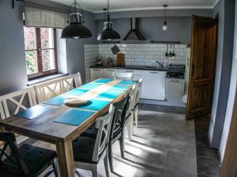 Kuchnia z dużą jadalnia z rodzinnym stołem idealnym do wspólnego biesiadowania.