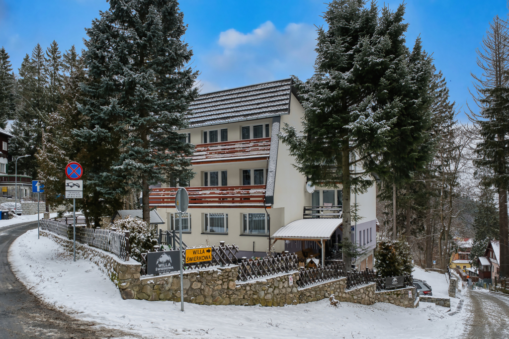 Willa Świerkowa położona jest na wysokości 700 m n.p.m. w cichej, zielonej dzielnicy Karpacza . Położenie zapewnia doskonałe warunki do całorocznego wypoczynku. W pobliżu ma swój początek większość szlaków turystycznych. Do centrum miasta mamy zaledwie 300 metrów. Oferujemy Państwu ładne pokoje z łazienkami (większość z balkonem). Dostępny jest bezpłatny parking, narciarnia, internet WI-Fi. Do dyspozycji Gości mamy bogato wyposażoną kuchnię i jadalnię. Doba hotelowa zaczyna się o godzinie 15:00, a kończy się o godzinie 10:00.